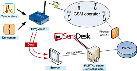 - انتقال اطلاعات تحت GPRS به نرم افزارها و سیستم های مانیتورنگ، پشتیبانی از پورتال SensDesk و HWg-Push جهت اتصال به نرم افزار Nagios.
